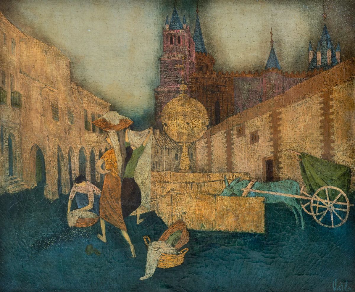 L'huile sur toile que nous présentons, intitulée Personnages dans la ville, peinte aux alentours des années 1960-1970, est caractéristique de sa production, empreinte de poésie et presque onirique. Varla représente des scènes de la vie quotidienne qui sont saisissantes de simplicité et de quiétude et où les personnages, délicatement tracés, évoluent dans une atmosphère irréelle.